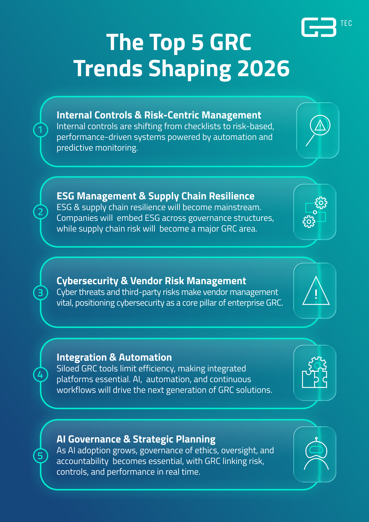 At the center of this transformation are five key forces: the revitalized role of internal controls in risk management, the rise of niche segments such as ESG and supply chain resilience, the growing weight of cybersecurity and vendor risk management, the shift toward fully integrated and automated GRC processes, and smarter strategic governance that aligns risks, finances, and business objectives.