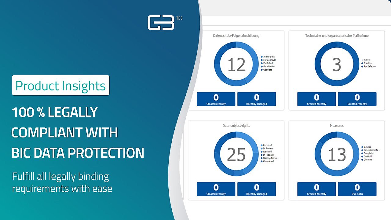 Digitalisieren Sie im Handumdrehen Ihre Datenschutzprozesse mit BIC Data Protection. Decken Sie alle gesetzlichen Anforderungen ab und schaffen Sie so Mehrwert für Ihr Unternehmen.