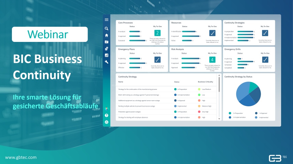 Business Continuity Management gewinnt seit geraumer Zeit immer mehr an Bedeutung. Aus diesem Grund gibt es im Bereich BCM international anerkannte Standards wie ISO 22301 und BSI 200-4, um die Widerstandsfähigkeit von Unternehmen zu stärken. Im Rahmen einer Live-Demo zeigen wir Ihnen, wie Sie mit BIC Business Continuity eine solide Grundlage für Ihr BCM schaffen und gleichzeitig allen gesetzlichen und regulatorischen Anforderungen entsprechen.
