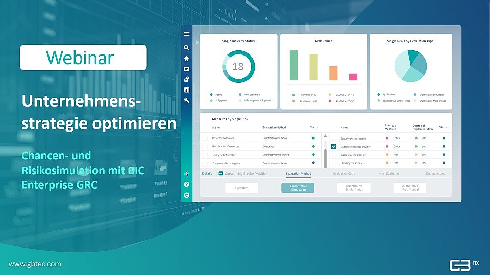 In unserem Webinar zeigen wir Ihnen anhand von Praxisbeispielen, wie Sie mithilfe unseres Tools BIC Enterprise GRC die Qualität Ihrer Risikoeinschätzungen erhöhen und somit echten Mehrwert für Ihr Unternehmen generieren. Durch die Verknüpfung von Chancen- und Risikosimulationen erhöht unsere vorgefertigte Softwarelösung die Genauigkeit Ihrer Gesamtbewertungen und unterstützt bei der Optimierung Ihrer Unternehmensstrategie. Ihre Vorteile auf einen Blick: