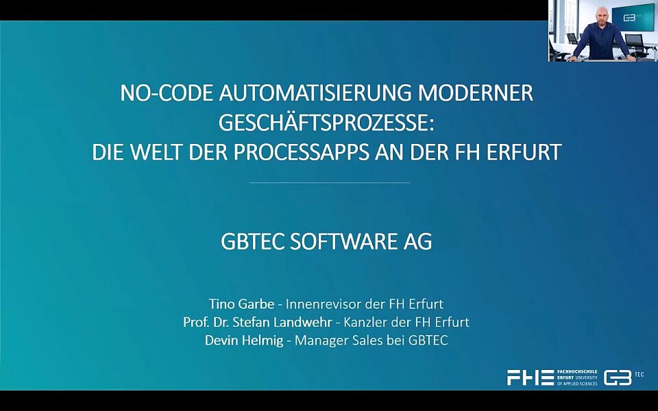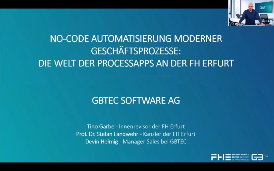 Gemeinsam mit unserem fachlichen Ansprechpartner Tino Garbe geben wir Ihnen konkrete Praxiseinblicke in die Prozessautomation an der Fachhochschule Erfurt. Als renommierte Hochschule muss sich die FH Erfurt tagtäglich intensiv mit modernen Administrationsprozessen auseinandersetzen. Durch den Einsatz von BIC Process Execution konnte bereits ein großes Spektrum dieser Geschäftsabläufe mittels „No-Code“ digitalisiert werden, wodurch die FH Erfurt erhebliche Effizienzgewinne realisiert hat.