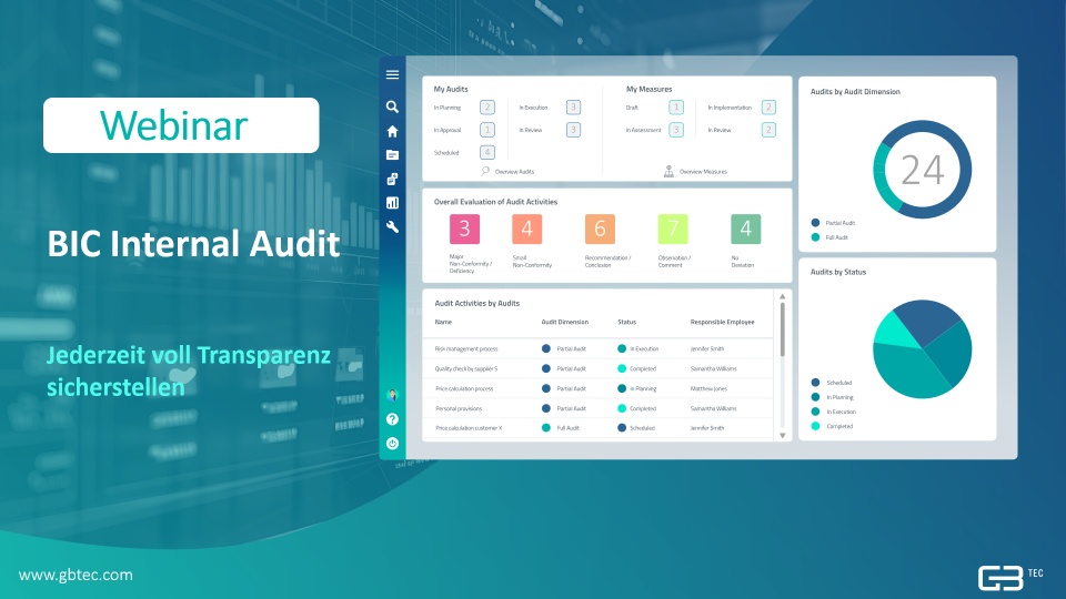 Lernen Sie die umfangreichen Vorzüge von softwaregestütztem Audit Management kennen und lassen Sie komplizierte, zeitaufwändige Methoden hinter sich. Durch den Einsatz unserer Softwarelösung BIC Internal Audit haben Sie Ihre Prozesse jederzeit im Blick, während sich gleichzeitig Ihr Arbeitspensum enorm reduziert. Entdecken Sie im Webinar die Highlights unserer State-of-the Art Software, die allen Anforderungen gerecht wird: