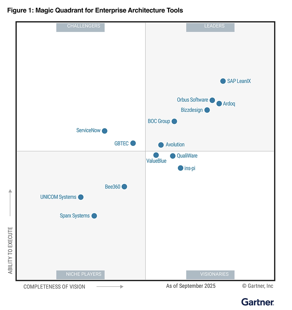 Gartner®, 2025 Magic Quadrant™ for Enterprise Architecture Tools, Von: Austin Steinmetz, Andrei Razvan Sachelarescu, Fred Ganter, Andrew Gianni, 6. Oktober 2025.